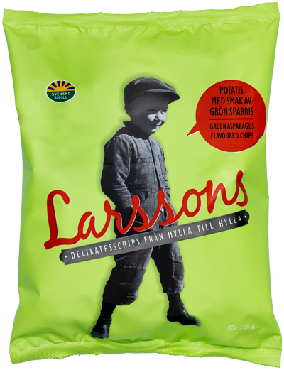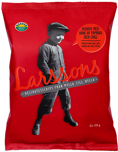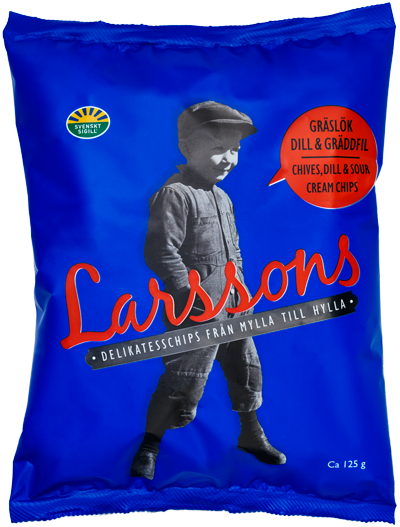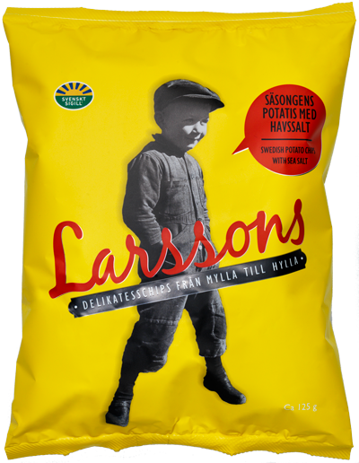 The little boy in the photograph on the front of the crisps packet is Ture Larsson, the father of Bitte and Bertil. Ture was born and raised on the farm and the photo is taken in 1938 when Ture was five years old. The story behind the photo of Ture begins when a photographer came driving to the village in a nice car. In order to get Ture to agree to pose for a photo, the photographer had to pay him 25 öre, which a very chuffed Ture put in his pocket. That’s why Ture has clenched his fist tightly in the pocket of the well worn – and perhaps not entirely photogenic – overall. This photograph has always been special to us; therefore we are especially delighted to be able to use it on our crisps packets. Ture was always very curious and wanted to discover new places. Our excellent cooperation with the airline SAS means that Ture is now travelling the world, as a sort of modern Nils Holgersson from the Selma Lagerlöf novel, with the help of Larsson’s crisps.