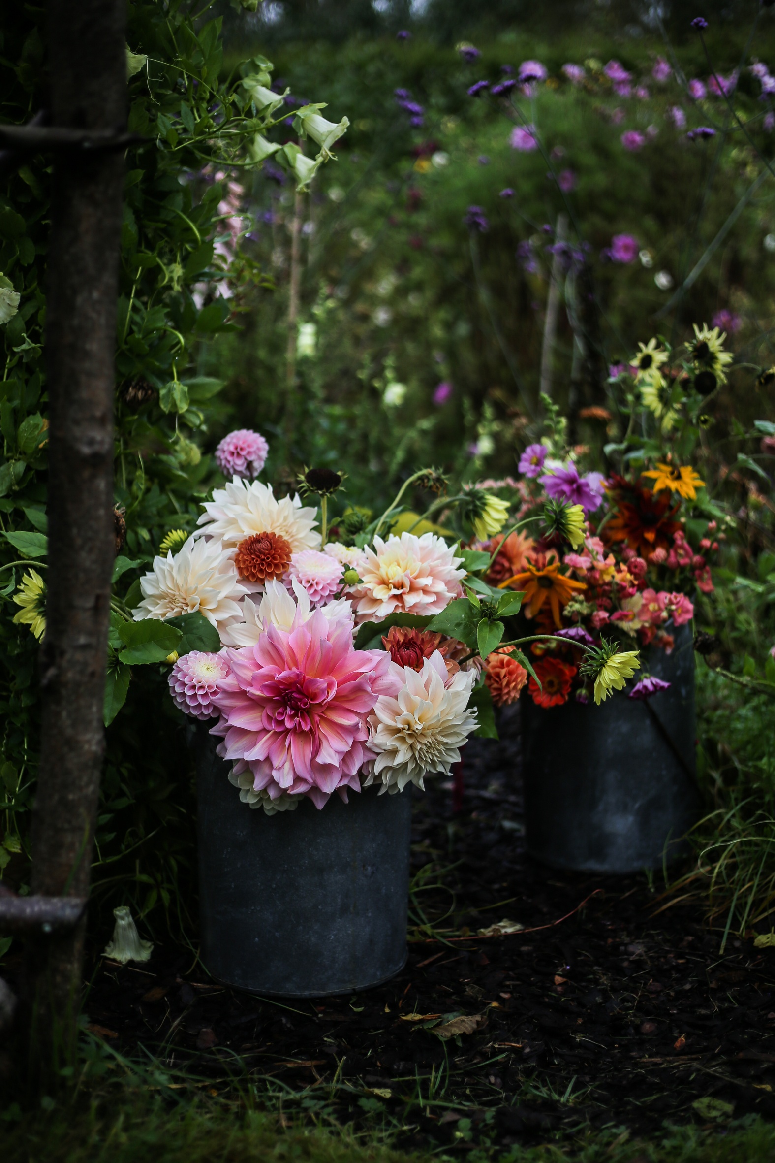 Skörda dahliorna på morgon eller tidig kväll. Använd en vass sax eller kniv och stoppa stjälkarna i vatten direkt. Välj ut de blommor som är halvöppna till ¾ öppna. Klipp av blommor precis ovanför en förgrening. Låt blommorna dra vatten under minst några timmar, helst över natten innan du arrangerar din bukett eller blomsterarrangemang. Dahlior håller 5-7 dagar i buketter inomhus.