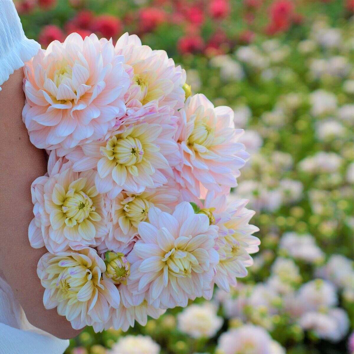 En homage till princessan Diana. En förtjusande dahlia i vitt, ljust gult och ljuv rosa. En underbar dahlia i både bukett och rabatt.
