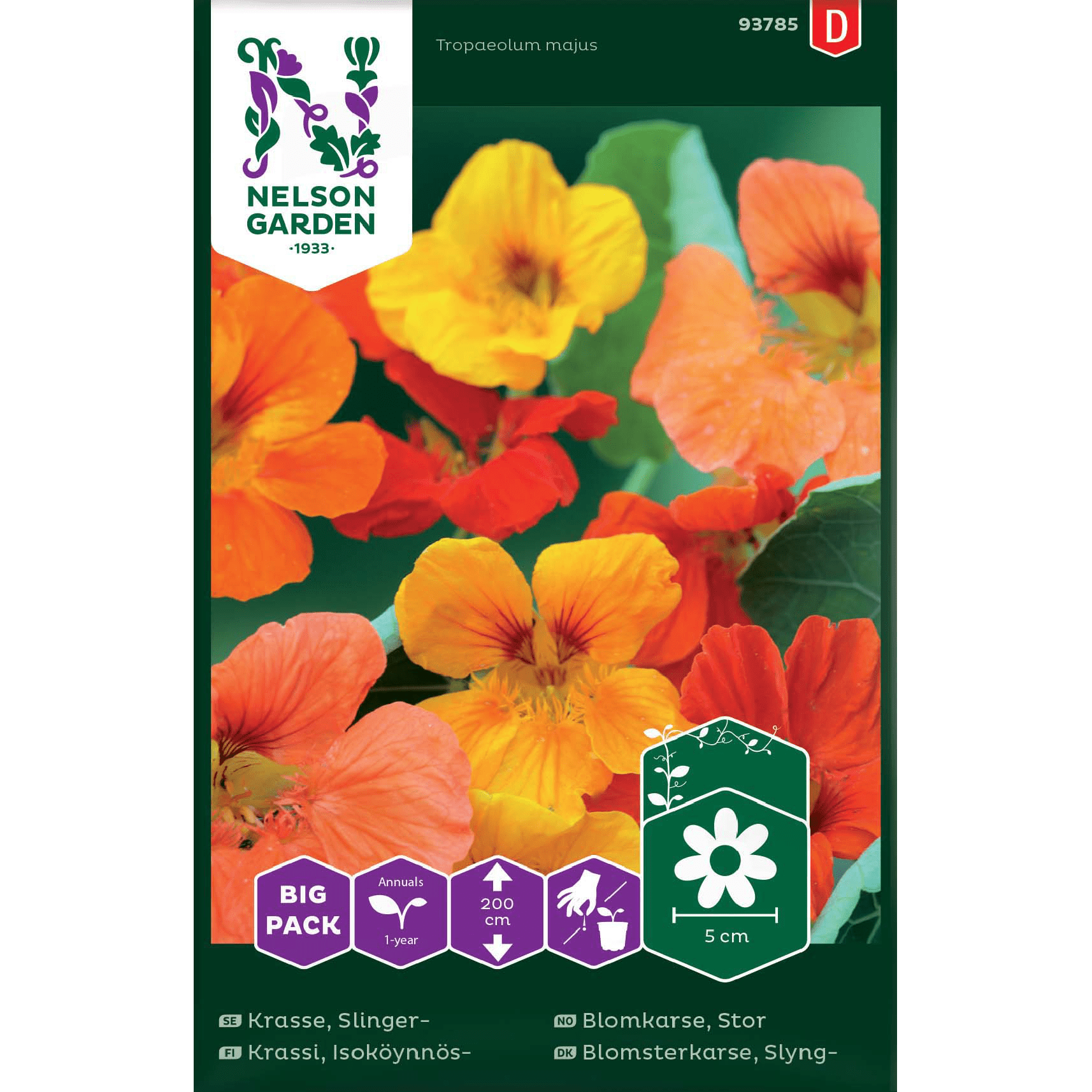 Färgstark och omtyckt sommarblomma i gula, orange och röda nyanser. Fin att odla i ampel, balkonglåda, mot spaljé och som marktäckande växt. Blommorna går att äta, dekorativa i sallader. Omogna frön kan läggas in som kapris. Trivs fint i mager och väldränerad jord. I alltför näringsrik jord utvecklas bladen på blommornas bekostnad. Vattna regelbundet. Lägg fröna i ljummet vatten ett dygn före sådd, så gror de säkrare.