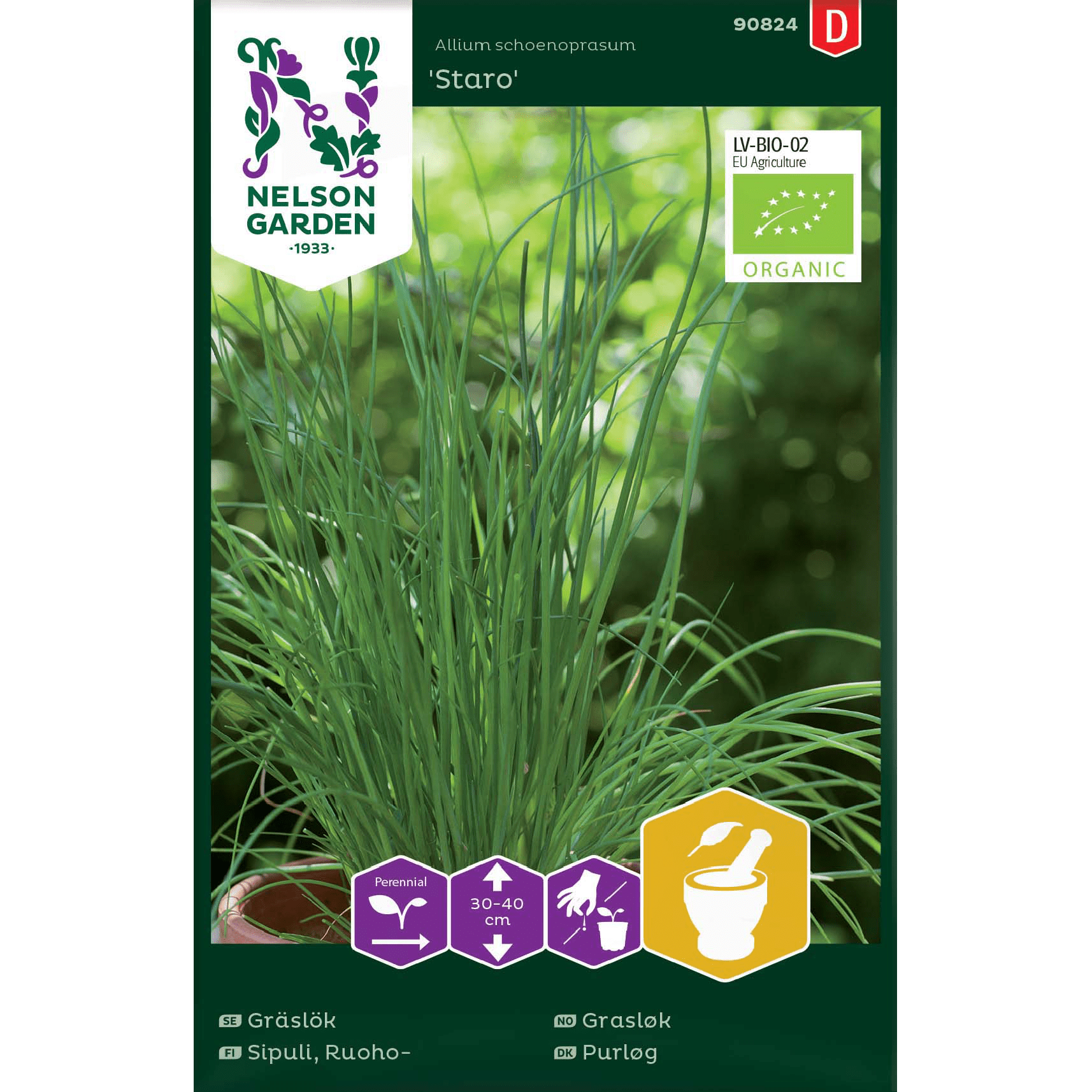 Ekologiskt frö. Denna sort ger smala blad med underbar arom och mild löksmak. Blommar med runda lila blommor. Skörda bladen efter hand och använd dem färska i sallader, kalla såser eller som dekoration. Även blommorna går att äta och de är mycket vackra att dekorera med.