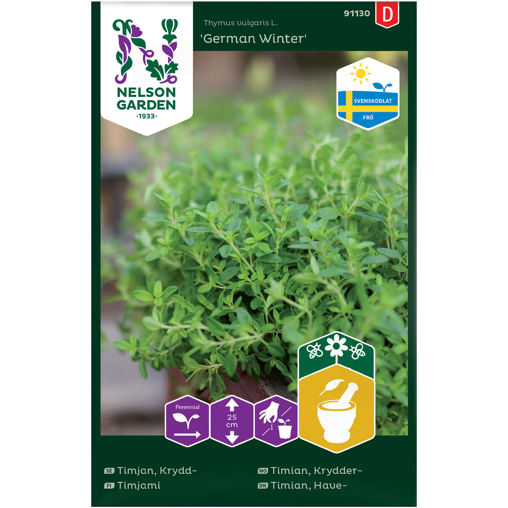 Svenskodlat frö. Lättodlad, vintergrön kryddväxt med små, mörkt gröna, aromatiska blad. Blommar vackert i rosalila och lockar då till sig bin och andra insekter. Tål torka. Bladen används färska eller torkade i matlagning. Skörda efter hand. För torkning plockas hela kvistar innan plantan blommar. Trivs i lucker, gärna mager jord men anspråkslös.
