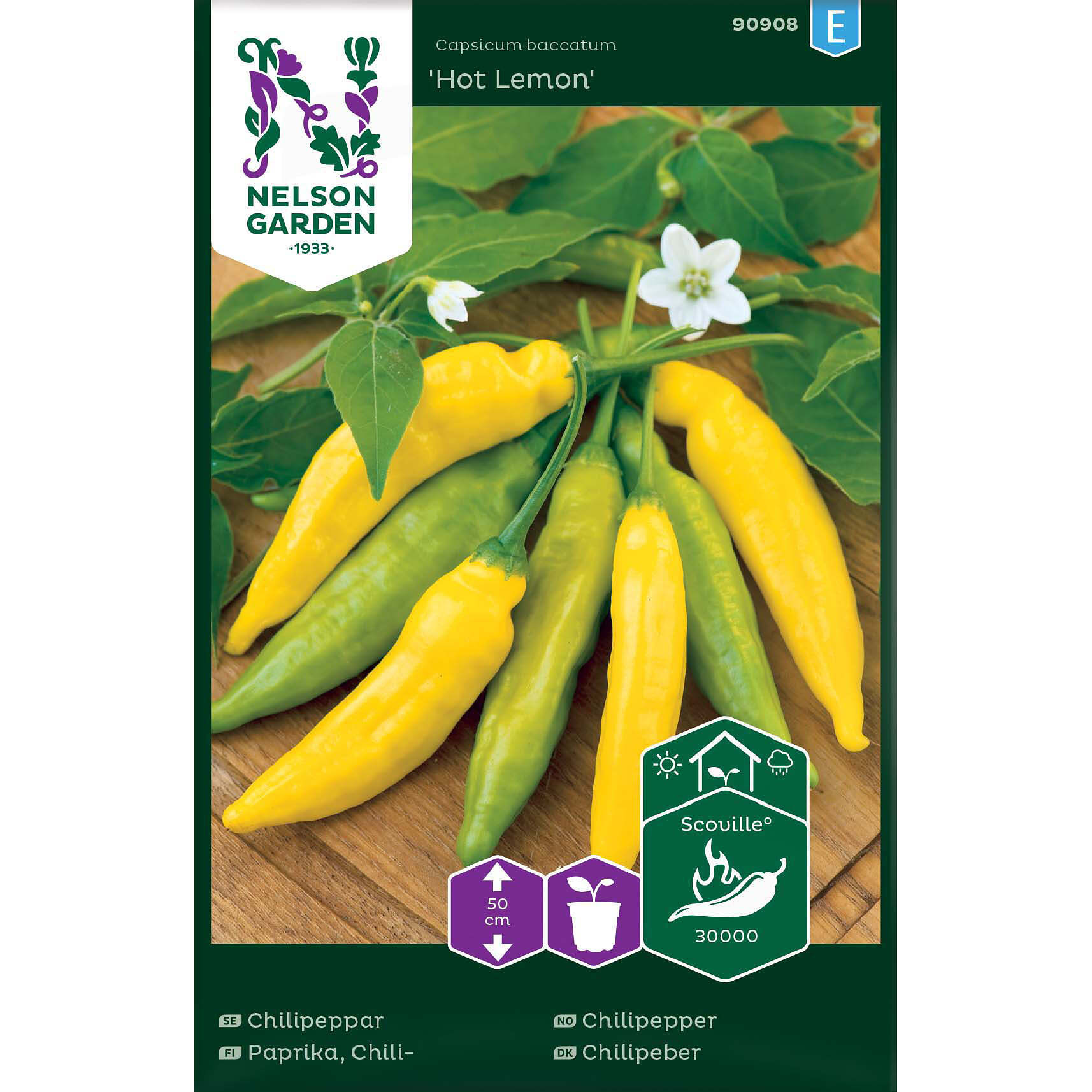 Spännande sort med doft och smak av citrus! Får ca 4 cm långa, gula frukter med stark hetta. Ypperlig till heta räkrätter. Avlägsna de heta fröna innan förtäring, använd kniv, tvätta händerna ordentligt direkt efteråt. Bra i kruka på altan, balkong eller i växthus. Gödsla och vattna regelbundet.