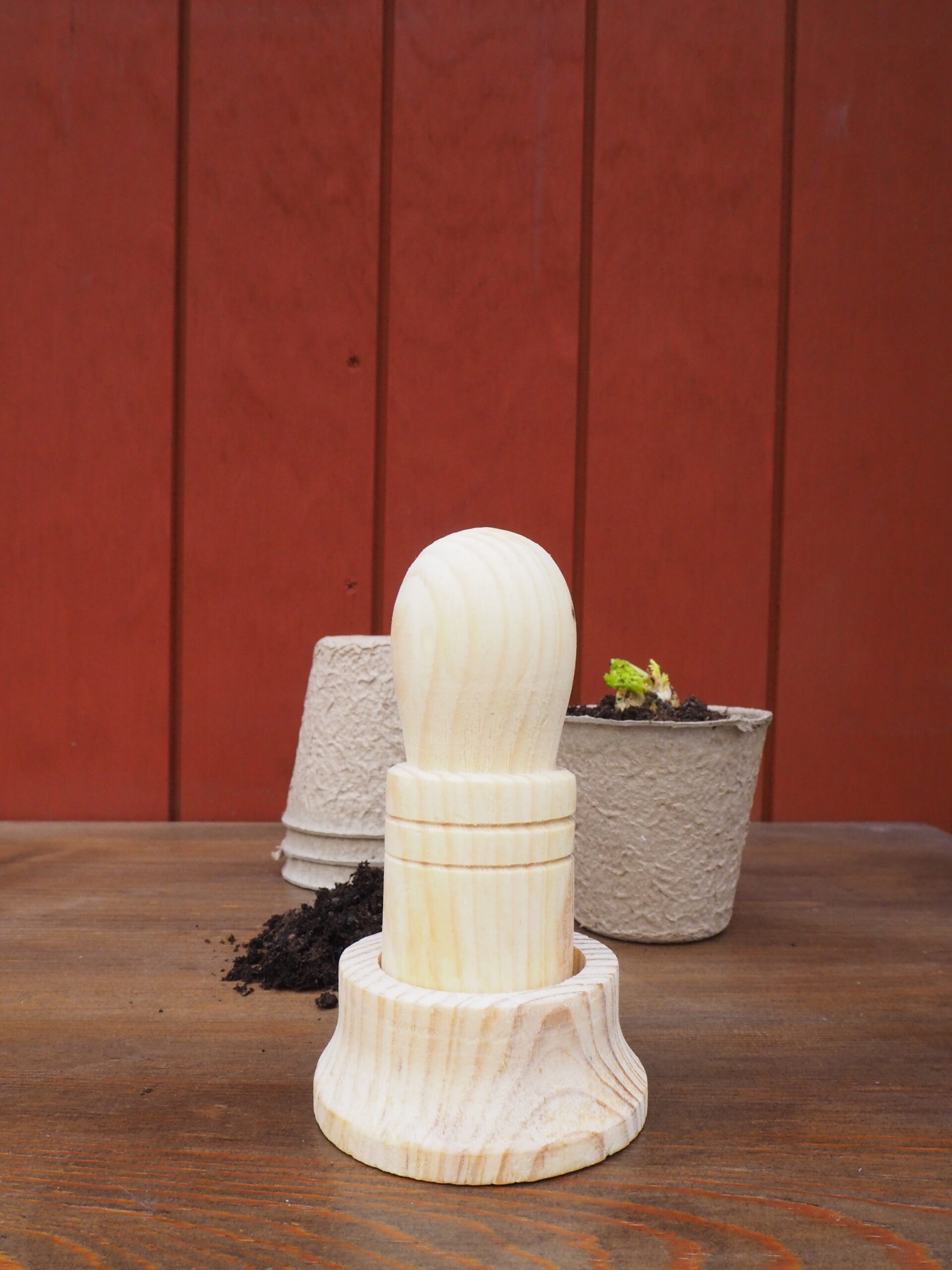 Svensktillverkad krukmakare i trä. Återanvänd tidningspapper för att göra egna odlingskrukor. Krukorna blir 4,5 cm i diameter och är perfekta för de flesta försådder: