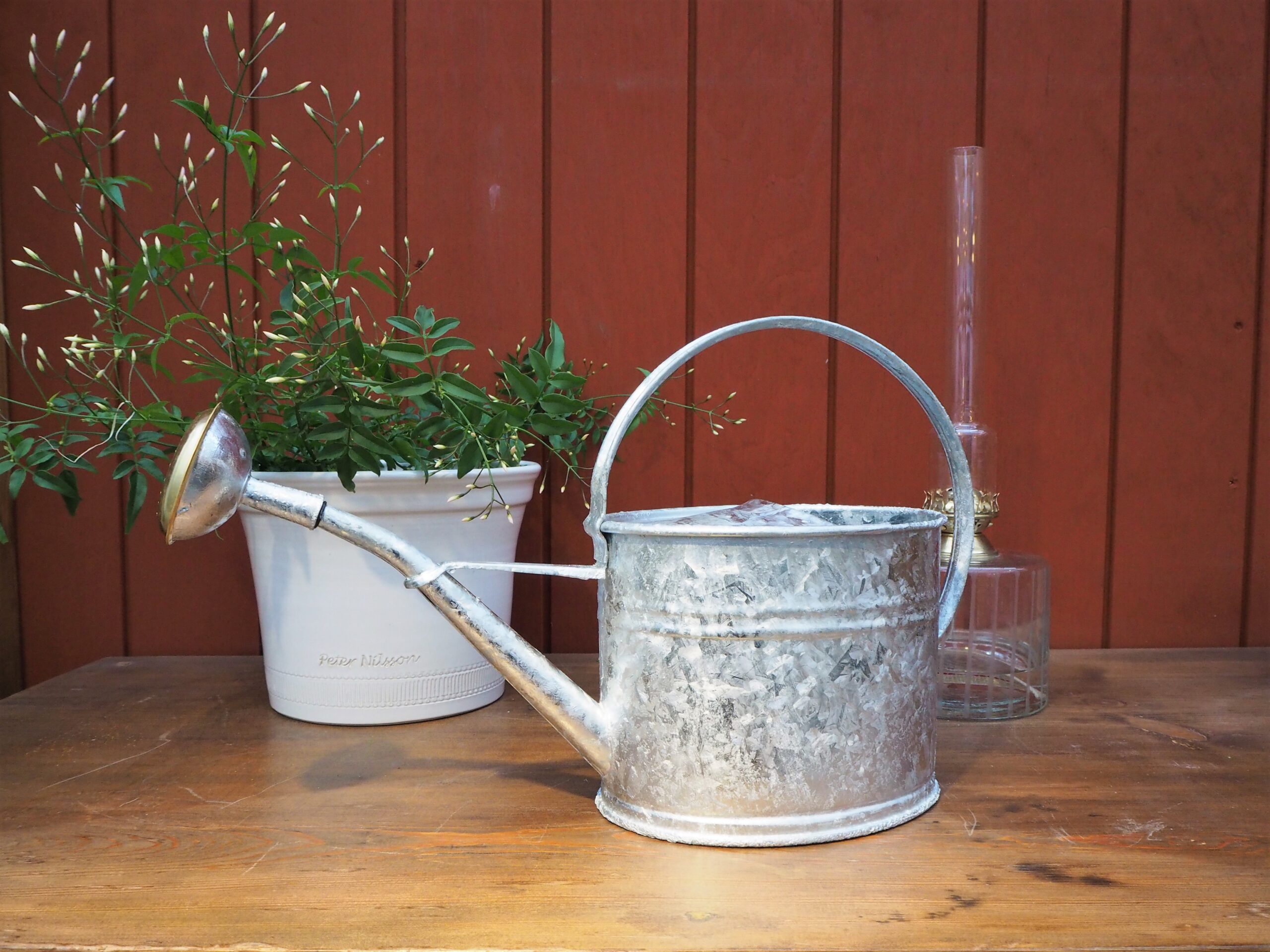 Klassisk vattenkanna i varmgalvad zink. Avtagbar stril i mässing.
