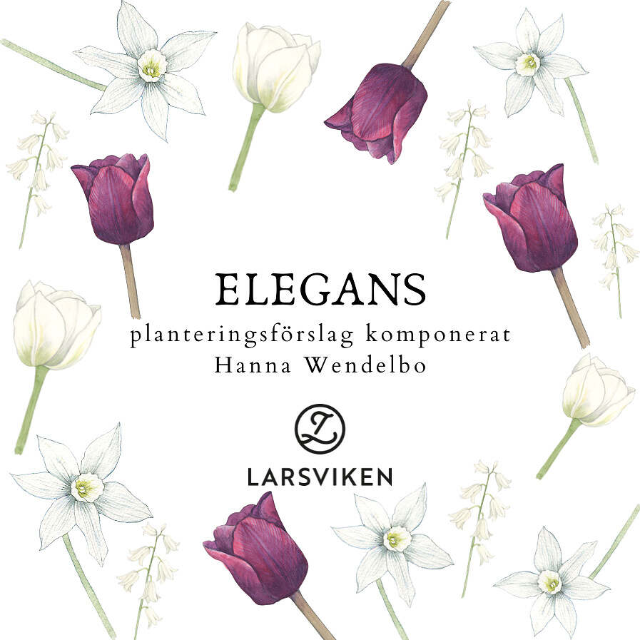 Blomstermixen Elegans bjuder på en elegant kombination av vita nyanser tillsammans med Bordeuxrött som övergår i nästintill svarta toner. Elegant, smakfullt och med finess! Över havet av de vita klockhyacinterna och orkidénarcissen ’Thalia’ vajar stolt de vita papegojtulpanerna och hela planteringen avslutas med de läckert mörka ’Ronaldo’ tulpanerna.