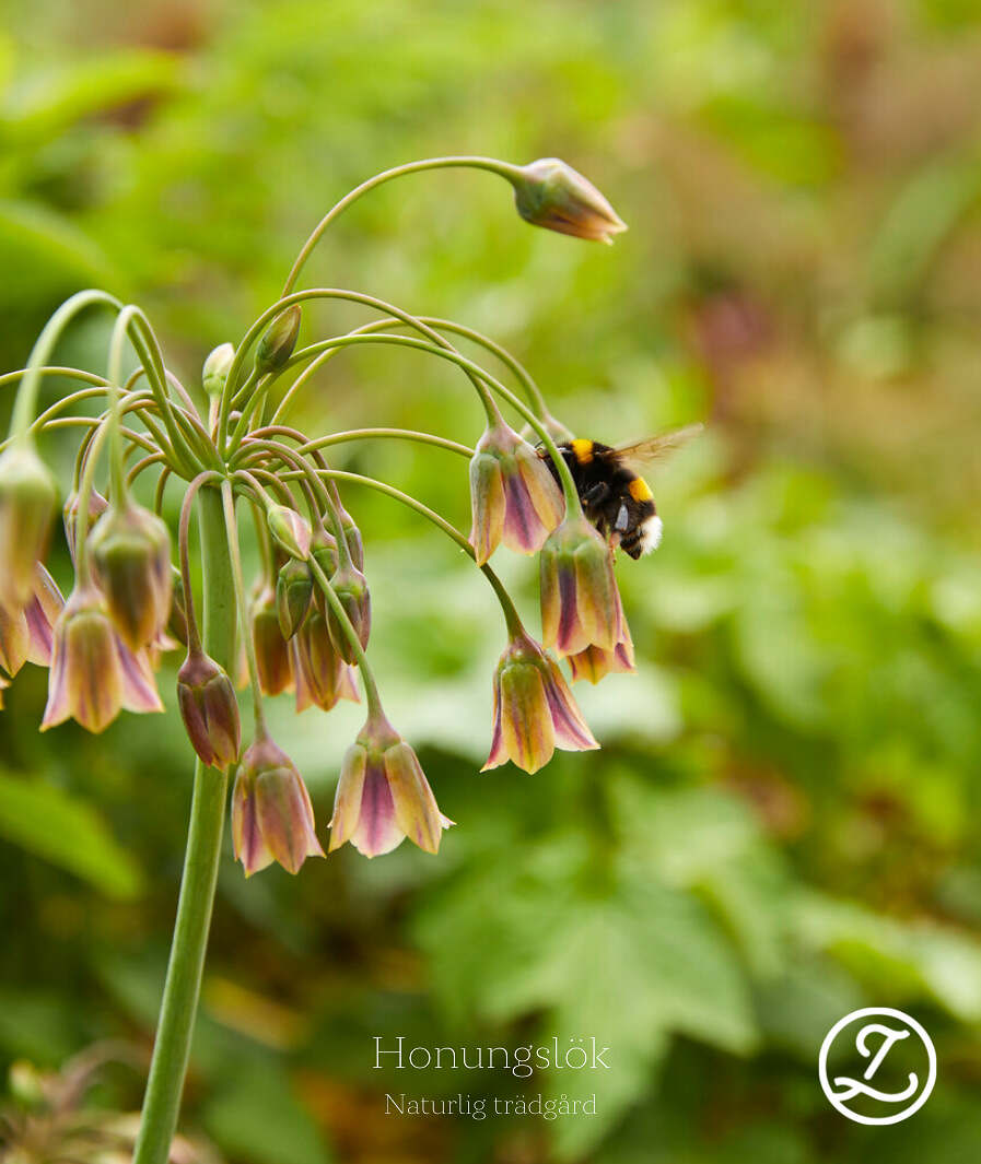Honungslök är en populär snittblomma som älskas av florister. Den är inte så vanlig i trädgården vilket är synd då den förgyller såväl rabatt som Woodland planteringar. Blommar på höga stänglar som blir uppåt 90 cm och varje stjälk avslutas med en krona av små klockformade blommor med lila, krämvita och gröna toner. Honungslök sägs kunna hålla ovälkomna inkräktare som t.ex. mullvad på avstånd då att de undviker att gräva i rabatten.