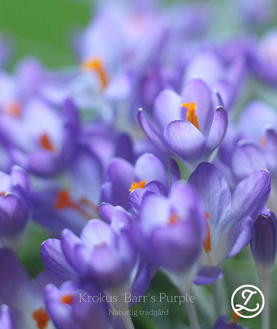 En krokus med ljust lila kronblad och en orange ståndare och pistill. ’Barr’s Purple’ är en mycket bra sort för dig som har drömt om en gräsmatta som fylls av lila små blommor tidigt på våren. Älskas av bin och humlor, och eftersom krokusen är en av de allra tidigaste blommorna på våren så är den en viktig blomma för de första pollinatörer på säsongen.