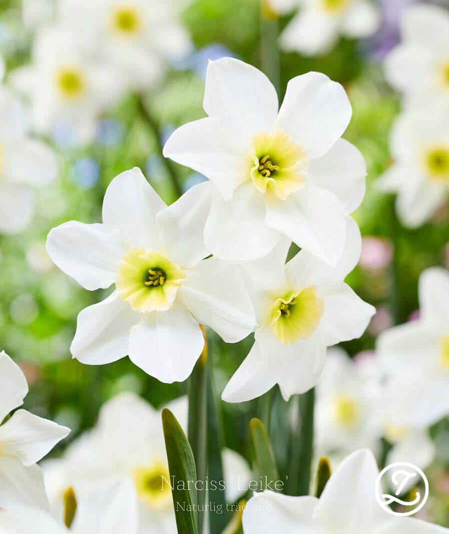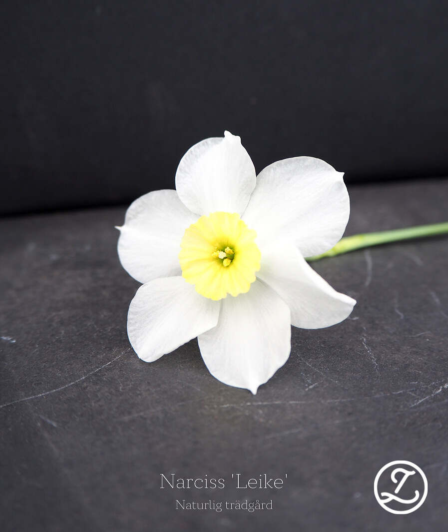 Liten och nätt narciss med kritvita kalkblad och en liten bikrona i ljust, ljust gult. Blommar rikligt och varje stjälk avslutas med 2-3 blommor. En riktig liten sötnos som blir som ett smycke i trädgården.