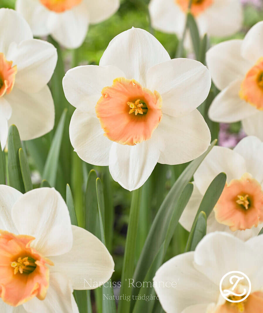 Skir, blomstrande och väldoftande. ’Romance’ är en riktig skönhet. Kalkbladen är crèmefärgade och bikronan är härligt aprikos. Wow!