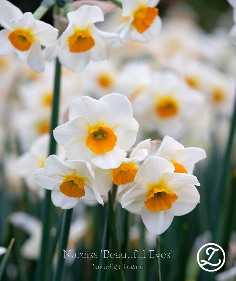 Beautiful Eyes är en förtjusande liten narciss. Med sin underbara doft och förtjusande exteriör sprider den glädje i såväl rabatt, kruka och inte minst i buketter. Kalkbladen är ljust gula för att sedan gå över i elfenbensvitt och tratten är soligt orangegul. Beautiful Eyes tillhör Jonquil gruppen och det bildas flera blommor per stängel samt varje lök producerar flera stänglar. Man skulle kunna beskriva varje stjälk som en liten bukett. Läckert!