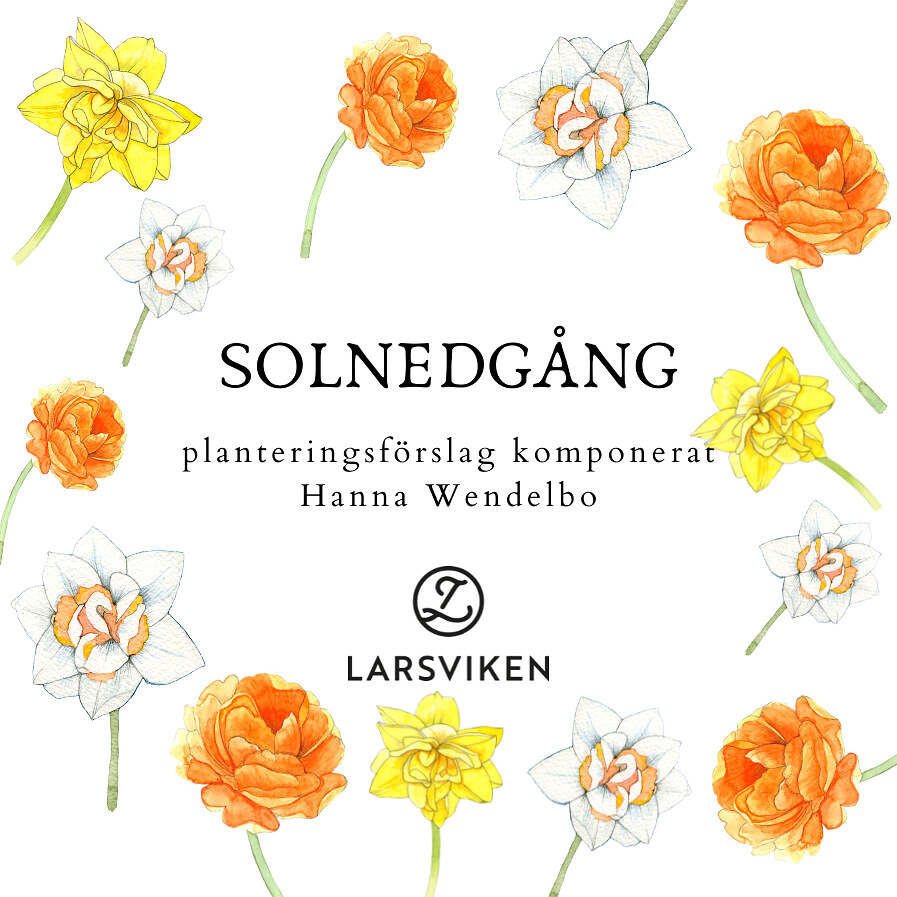 Blomsterlöksmixen Solnedgång bjuder på olika toner i gult, korall, orange, rosa, rött och aprikos. En förförisk färgkavalkad som sprider värmande toner i trädgård och i buketter. Hanna beskriver mixen som en solvarm dröm i de läckraste färger. De dubbla narcisserna ’Tête Rosette’ och ’Tahiti’ med sina solvarma färger fångas upp av tonerna i den dubbla tulpanen ’Icoon’ vars färg och form är ett soligt mästerverk.