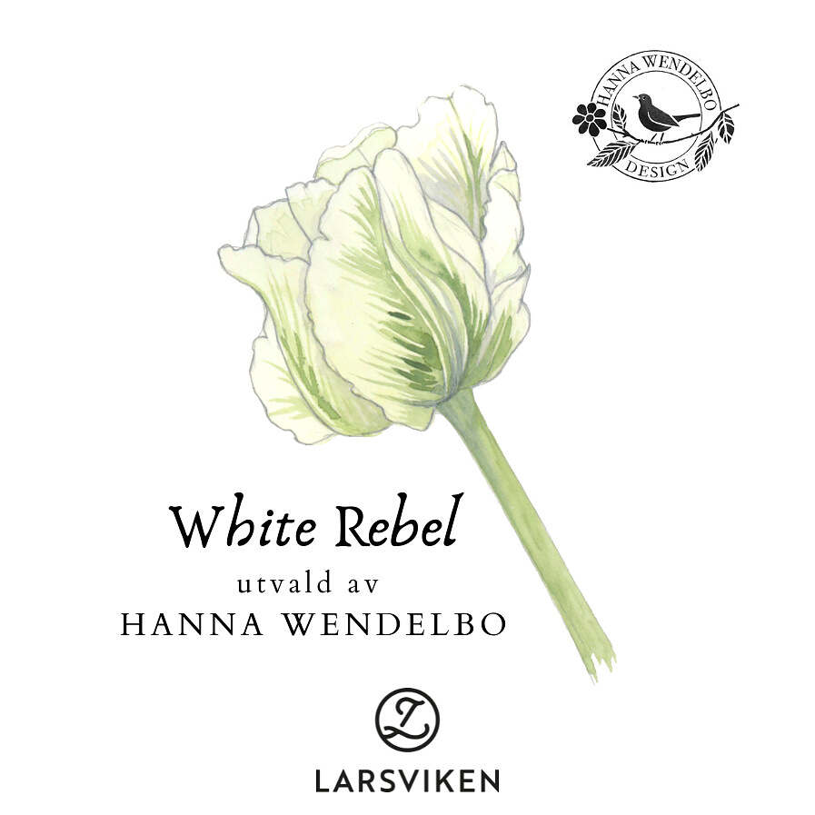 ’White Rebel’ är en papegojtulpan med dess karaktäristiska vridna och flerfärgade kronblad. En vacker sort med vita kronblad som går över i crème och grönt. Förgyller trädgårdens rabatter och buketter. Som ett konstverk!