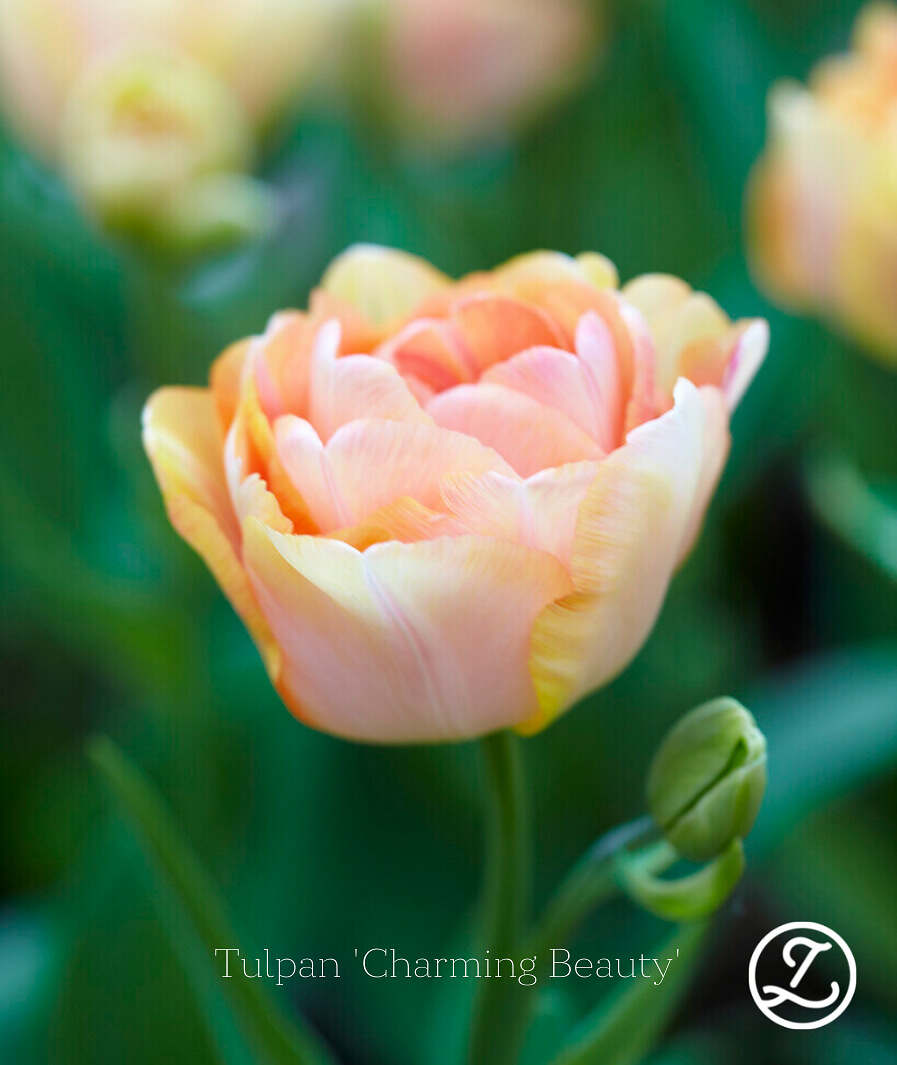 Tänk att kunna fånga färgerna i den finaste solnedgången och återskapa dem i en rabatt eller bukett. Nu är det nästan möjligt genom Charming Beauty som med sina magiska toner av ljust gult, rosa, aprikos och orange. Blommorna är maffigt fyllda och blir mycket dekorativa i så väl rabatt som blomsterarrangemang. Tillhör gruppen fyllda sena tulpaner.