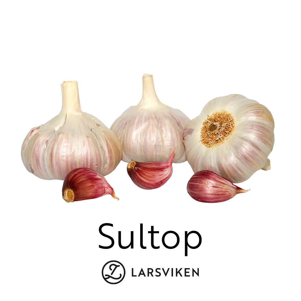En pålitlig sort som är både starkväxande, mycket härdig och ger stor skörd. Mycket vacker lök med rosa toner som ger ca 12-15 klyftor. Klyftorna är lätta att skala och har en stark vitlökssmak. En härdig sort som tål både köldknäppar och frost. Sultop är en sen sort och vi rekommenderar att odla den tillsammans med någon av våra tidigare sorter t.ex. Sabagold eller Primor.