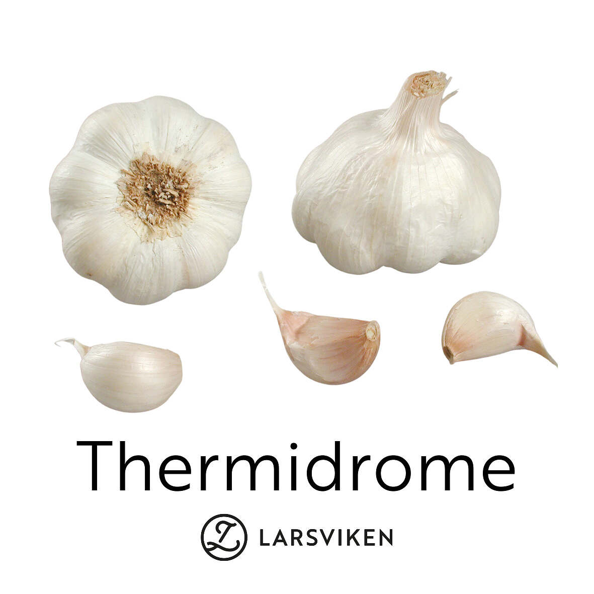 Thermidrome är en klassiker och ett välbeprövat kort bland grönsaksodlare runt om i Sverige, då den verkligen passar att odla i vårt nordiska klimat. Lökarna blir stora och har vitt skal med lila strimmor. Klyftorna blir stora och har en mild och finstämd smak. Passar utmärkt för inlagring och förgyller vinterns middagar.